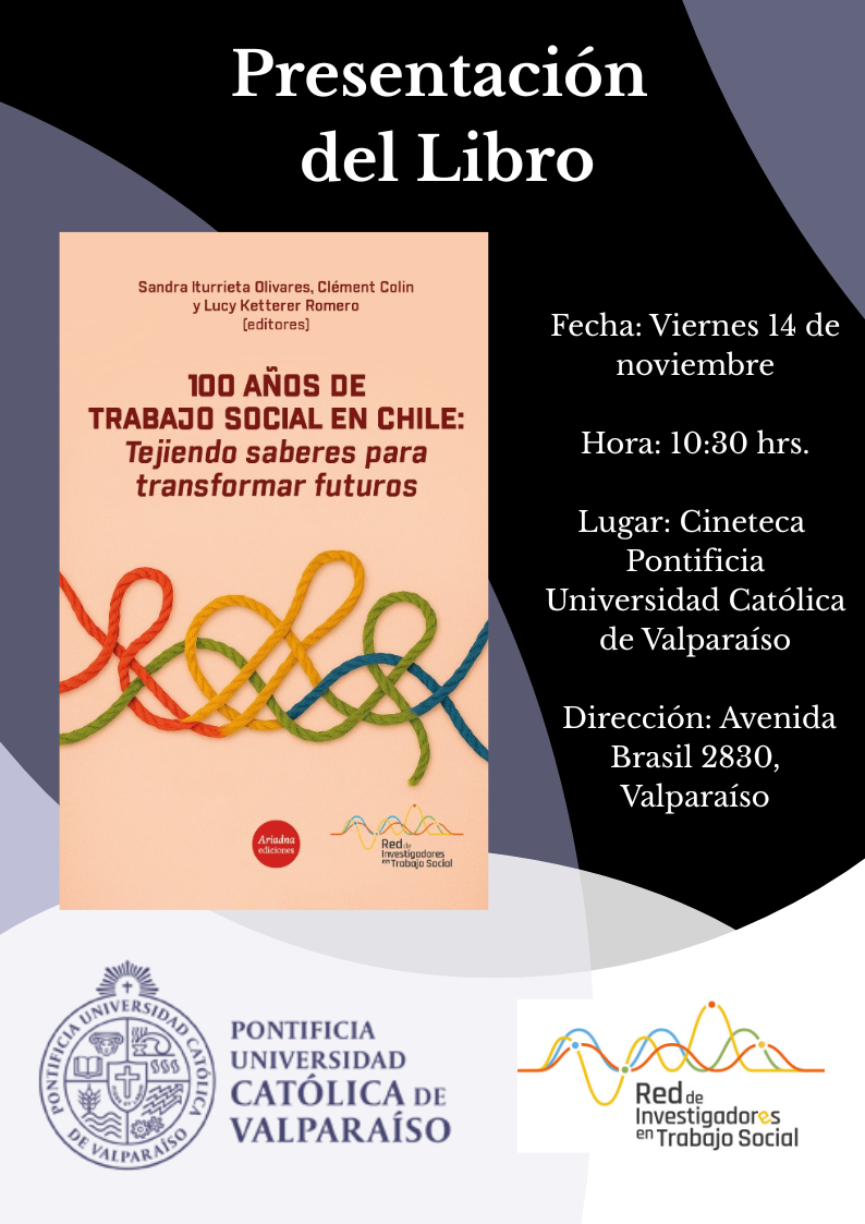 La Pontificia Universidad Católica de Valparaíso y la Red de Investigadores en Trabajo Social tienen el agrado de invitarle a la presentación del libro “100 años de Trabajo Social en Chile: Tejiendo saberes para transformar futuros”, editado por Sandra Iturrieta Olivares, Clément Colin y Lucy Ketterer Romero.